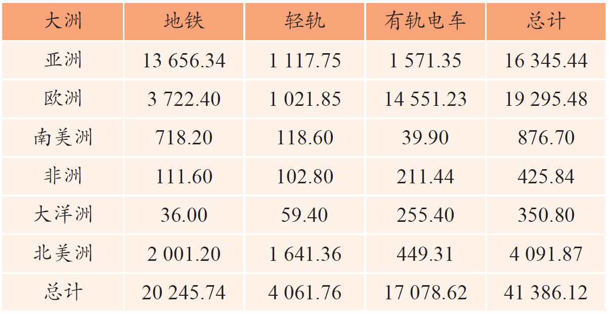 Слика 1 ја прикажува вкупната скала на урбаниот железнички транзит низ главните континенти во светот (Забелешка: Сите градови во Русија се класифицирани во Европа за пресметка). Податоците покажуваат дека метрото и трамваите се главните типови на градски железнички транзит на глобално ниво, а глобалниот урбан железнички транзит е главно концентриран во Евроазија, а метроата главно се дистрибуирани во азиските земји.[1]