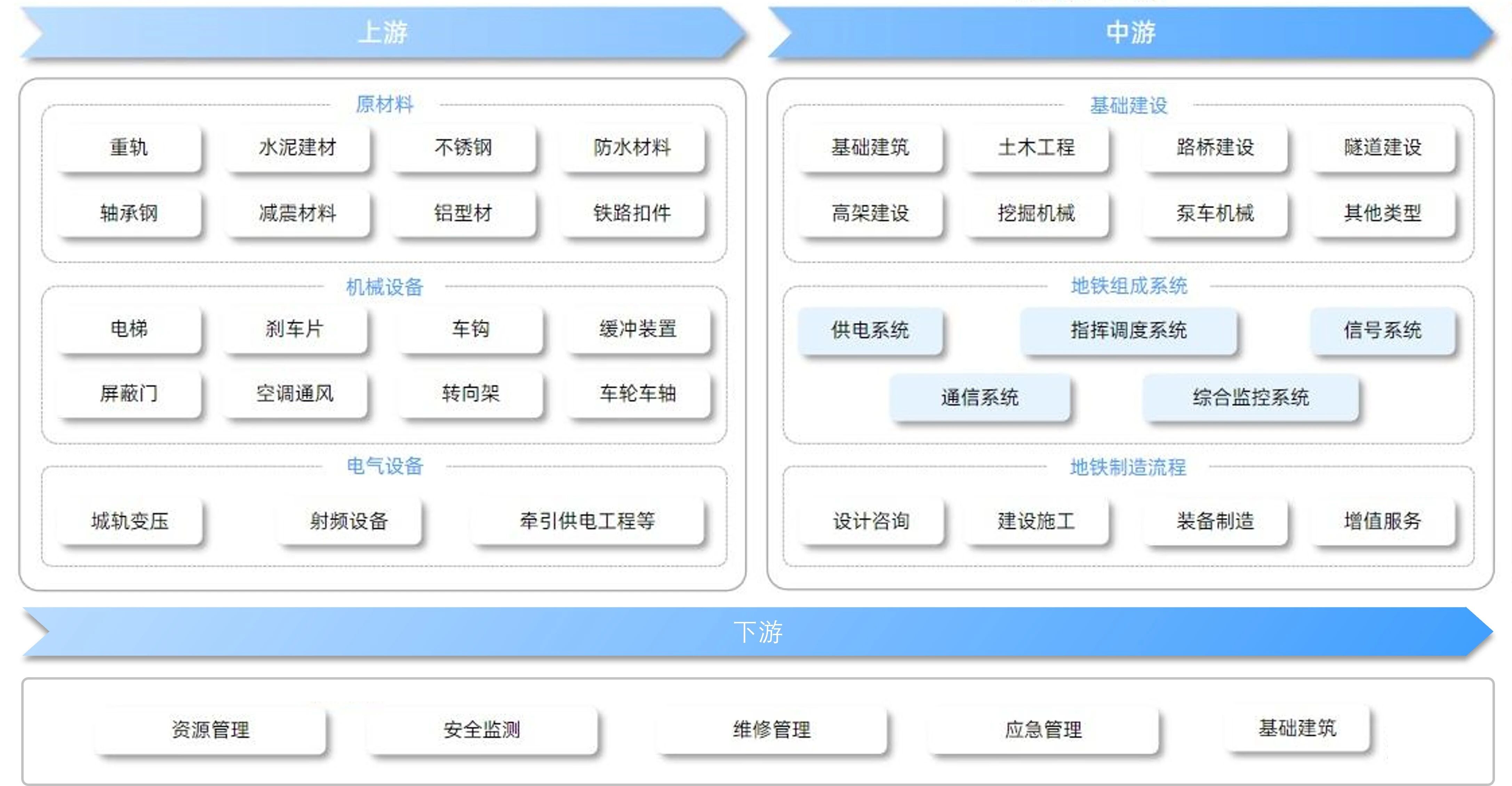 Железничкиот транзит ги поврзува урбаните индустрии, го промовира проширувањето на индустрискиот синџир и го поттикнува брзиот развој на придружните индустрии како што се производството на опрема и технолошкото истражување и развој. Синџирот на индустријата на метрото е прикажан на Слика 3, каде што сите врски се меѓусебно зависни и го поттикнуваат економскиот развој на урбаните агломерации и метрополитенските области.[2]