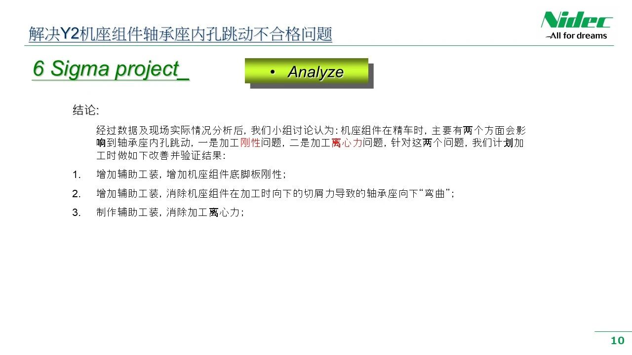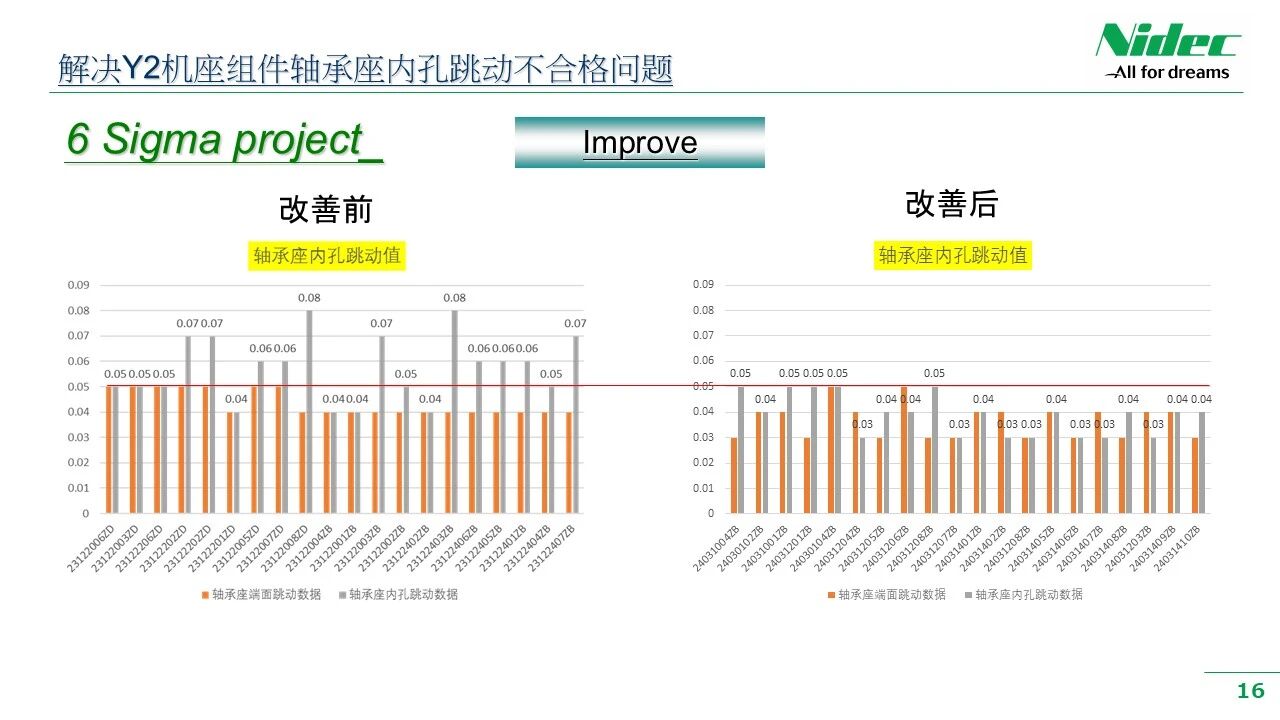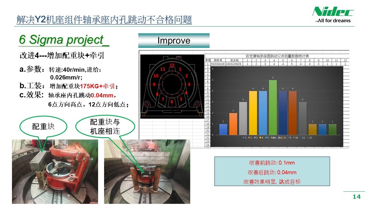 Придржувајќи се до политиката за квалитет и филозофијата за управување на компанијата „Задоволувајте се себеси, задоволувајте клиенти, бидете искрени и доверливи и стремете се кон извонредност“, ние постојано им обезбедуваме на клиентите производи со повисока цена - ефективност и постабилен квалитет. Неодамна, во работилницата за обработка, се појави феномен каде клучните димензии или геометриските толеранции на некои клучни процеси се нестабилни по обработката и не ги исполнуваат барањата за контрола на 6 - Сигма. Менаџментот на компанијата придава големо значење на ова и ја промовираше работилницата за да формира работна група за подобрување на квалитетот на работилницата. Оваа работна група се состои од лидери од релевантни одделенија, релевантни инженери, лидери на тимови и вработени во производството од првата линија. Со користење на методот DMAIC од 6 - подобрување на Сигма, започна сеопфатна кампања за подобрување на квалитетот. Преку низа активности за подобрување, како што се истражување на позадината, собирање податоци, резиме на проблемот, анализа на причините и формулирање на краткорочни и долгорочни мерки за подобрување, работата за подобрување на квалитетот е целосно спроведена. Оваа активност за подобрување сеопфатно ја подобри практичната способност на менаџерите и вработените од основната основа за разбирање, примена и промовирање на алатките за подобрување на 6 - Сигма на паралелен начин. Тоа помага да се намалат варијациите и флуктуациите на карактеристиките на квалитетот на обработените делови, а со тоа да се подобри севкупниот производствен квалитет на моторите и да се помогне на клиентите да им се обезбедат производи со подобар квалитет.